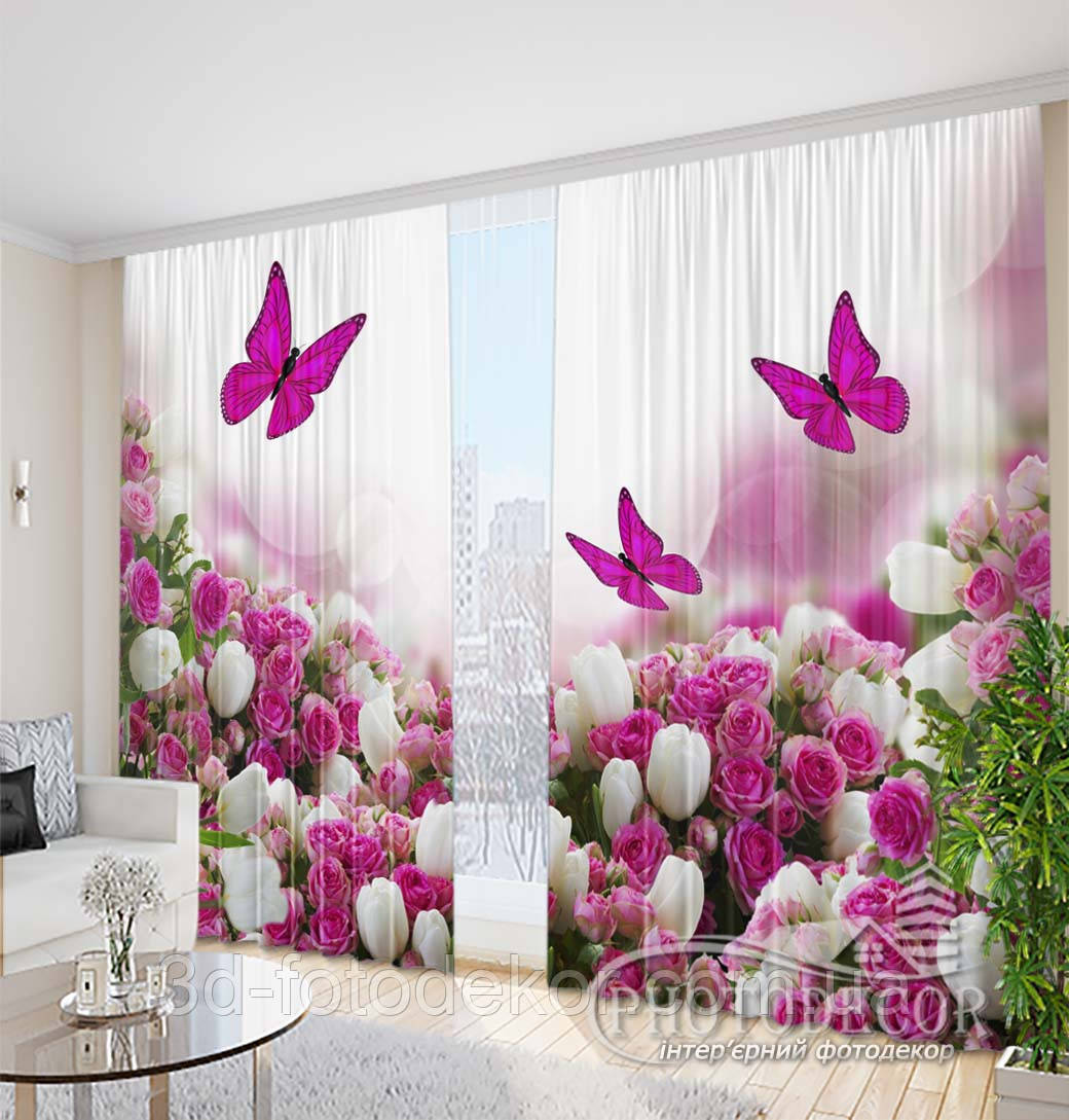 Фото Штори "Білі тюльпани з трояндами та метеликами" 2,5м*2,9м (2 полотна по 1,45м), тасьма